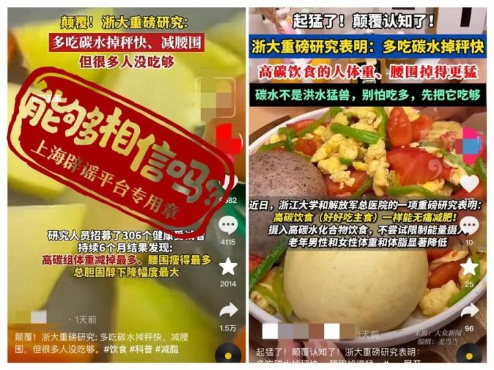 以刚辟谣“冷冻馒头长黄曲霉素”的浙大为例,这两天网上又有一项宣称来自浙大的“重磅商讨恶果”——多个账号发帖称,浙大商讨发现“多吃碳水掉秤快、减腰身,但好多东说念主没吃够”。