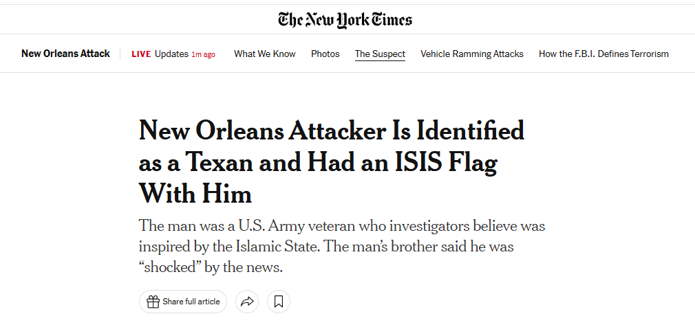 当地时候1月1日凌晨,好意思国路易斯安那州新奥尔良市发生汽车冲撞东说念主群事件,事件已酿成15东说念主物化,多东说念主受伤。现在,这起蹙迫事件的嫌疑东说念主也被爆出了一些浩瀚信息。